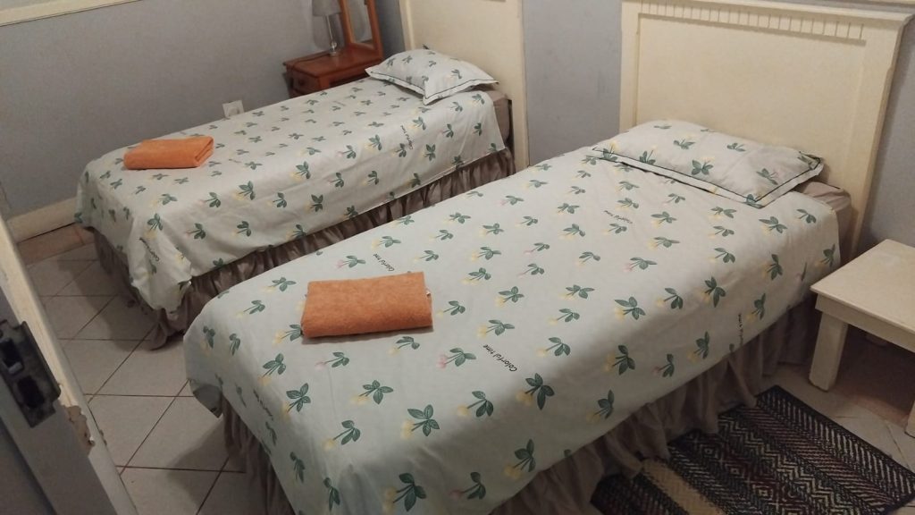 There are 2 bedrooms, one with 3 x single beds and one with a queen bed.